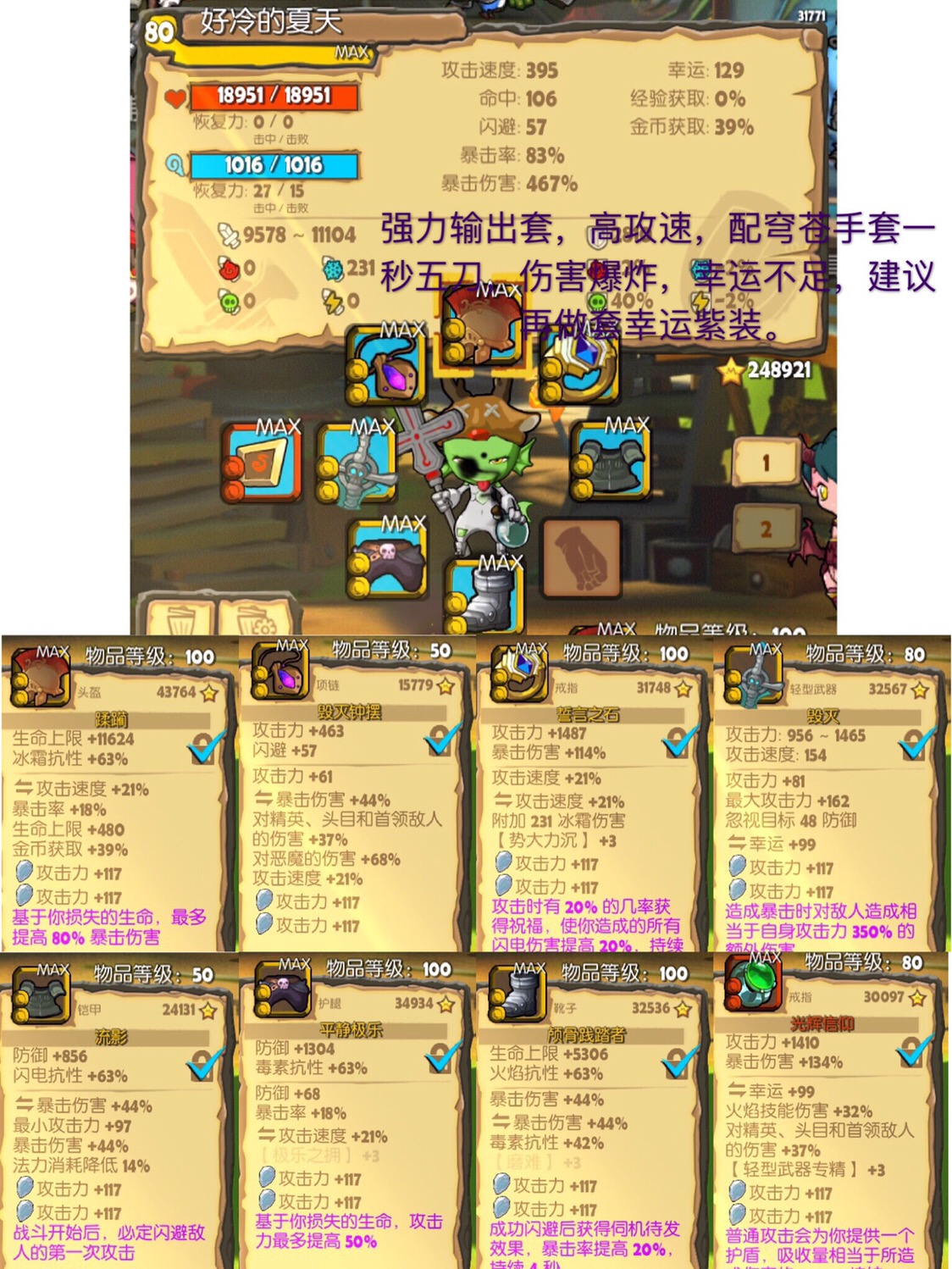 15、由于策划设计缺陷,各种长柄武器,重武器和法系裝备都不怎么样,只有轻武器走高速高伤害路线才可以快速清怪,打出爆炸伤害。这个版本的毕业装可能在下个版本出了新装备就论落为仓库货,做好打无尽模式的四件套加一套紫色低等级幸运装同样可以打爆各种关卡和副本,依据自己的喜欢,游戏才能玩出自己的味道。